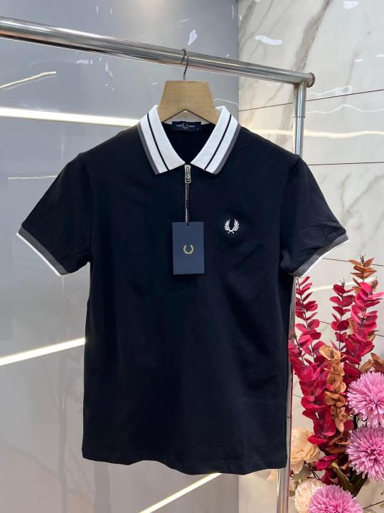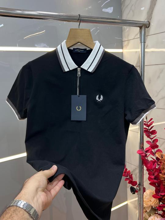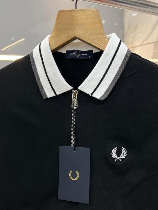 Home T-Shirts Fred Perr y Black Premium Cotton Lycra Pique fabric Polo Tshirt with Collar Design and Embroidered Logo Zip Style 3380